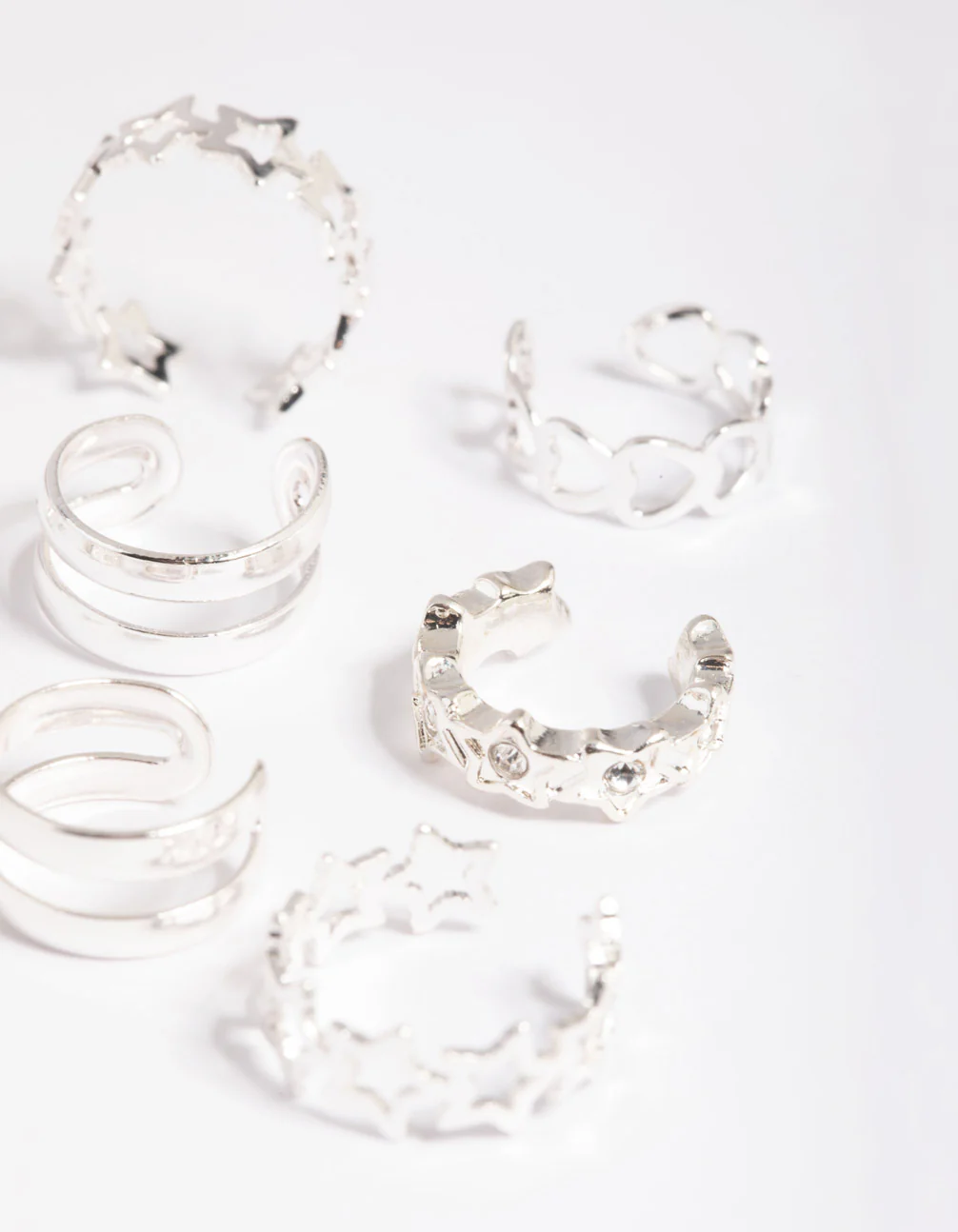 Mix them, match them, stack them! Our earring packs are designed to be layered. This silver-toned set includes eight earrings with star and heart motifs. Get your ear stack started and get creative!