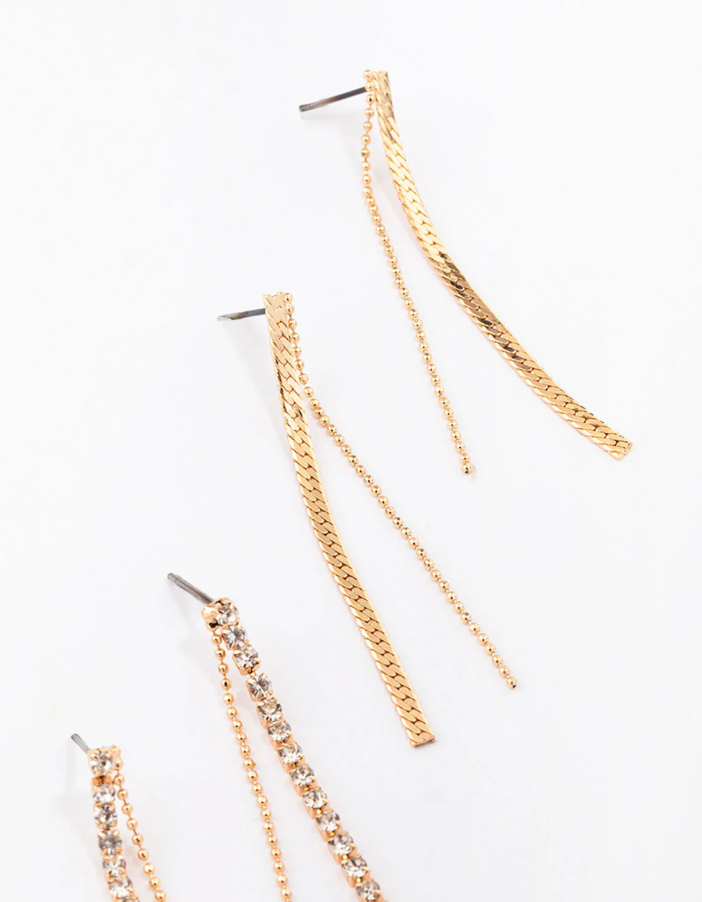 Elevate your stack with this set of gorgeous, gold-toned drop earrings. This earring pack contains three sets of dangle earrings, designed with diamante-encrusted chains for a touch of glamour.