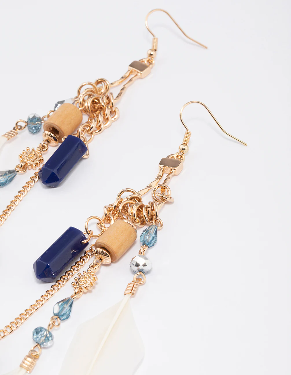 - These drop earrings feature delicate, white feathers and are embellished with strands of delicate blue and brown beading for a resort-inspired look.