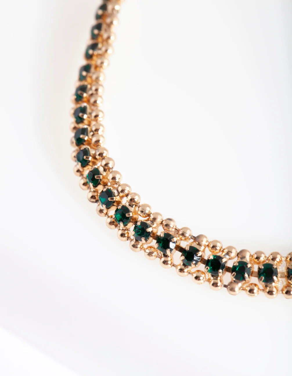 This gold-toned bracelet features faux emerald stones on a bracelet with an adjustable toggle clasp. Wear it with other green pieces for a glamourous evening look.